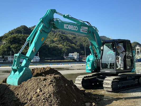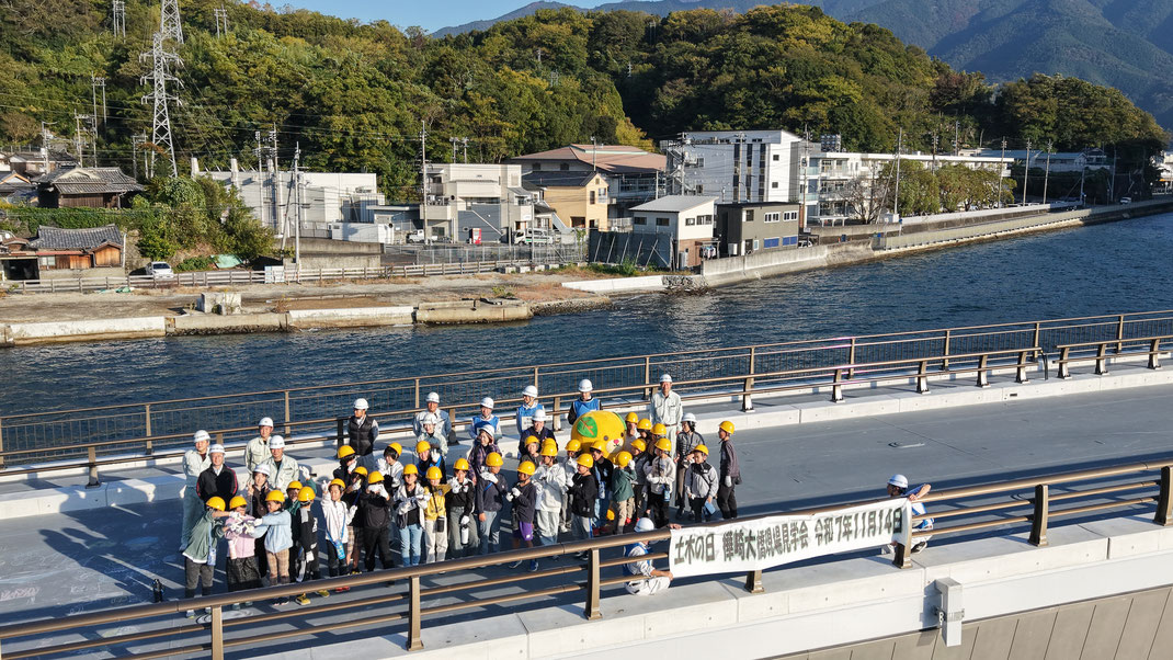 お知らせ · 2025/11/14 令和7年度 樺崎大橋見学会 令和7年土木の日 樺崎大橋現場見学会が11月14日(金)に大浦ふ頭(大浦埋立地)で開催され一若建設も担当し参加しました。 当日は、0.45m3バックホウの操作体験や測量機器の光波トランシットを使用したサッカーボールの飛距離計測などの催しが行われました。 また次期完成予定の樺崎大橋の下地に、お絵描きをする体験を住吉小学校の児童たちは、思い思いの絵や文字を楽しみながら描きこんでいました。 tagPlaceholderカテゴリ: