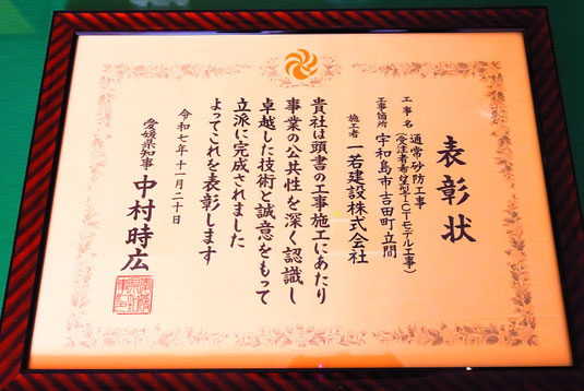 お知らせ · 2025/11/20 愛媛県知事表彰を頂きました。 令和7年11月20日に愛媛県知事 中村時広 様より 工事名「通常砂防工事(受注者希望型ICTモデル工事)が表彰されました。また来年も頂けるよう精進するとともに、人と自然にやさしい工事を努めてまいります。 tagPlaceholderカテゴリ: